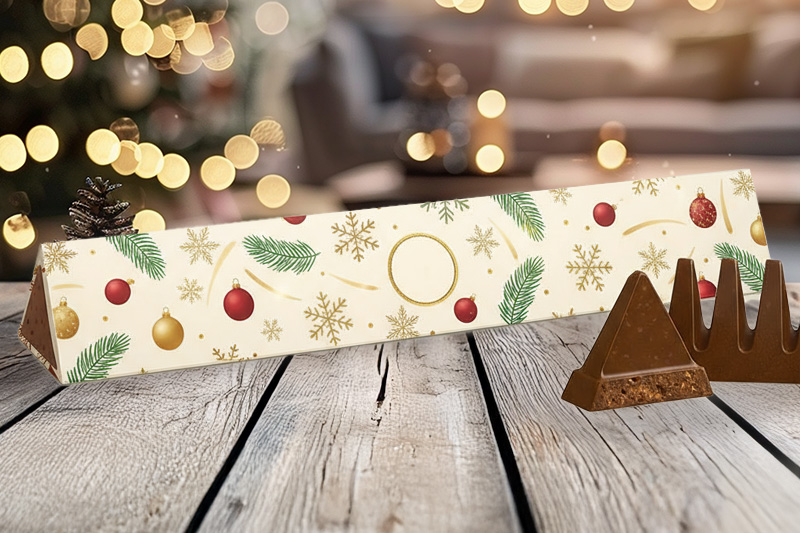Personalizzarlo con il logo aziendale o con il nome dei collaboratori è un modo originale per trasformare una barretta di cioccolato in un gadget natalizio elegante e riconoscibile.